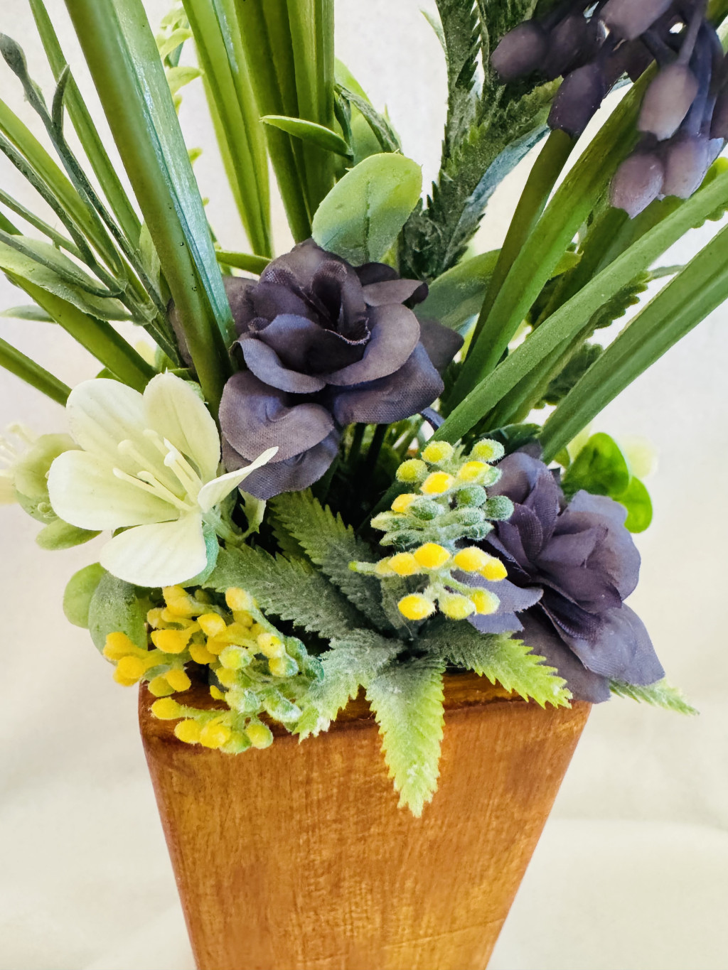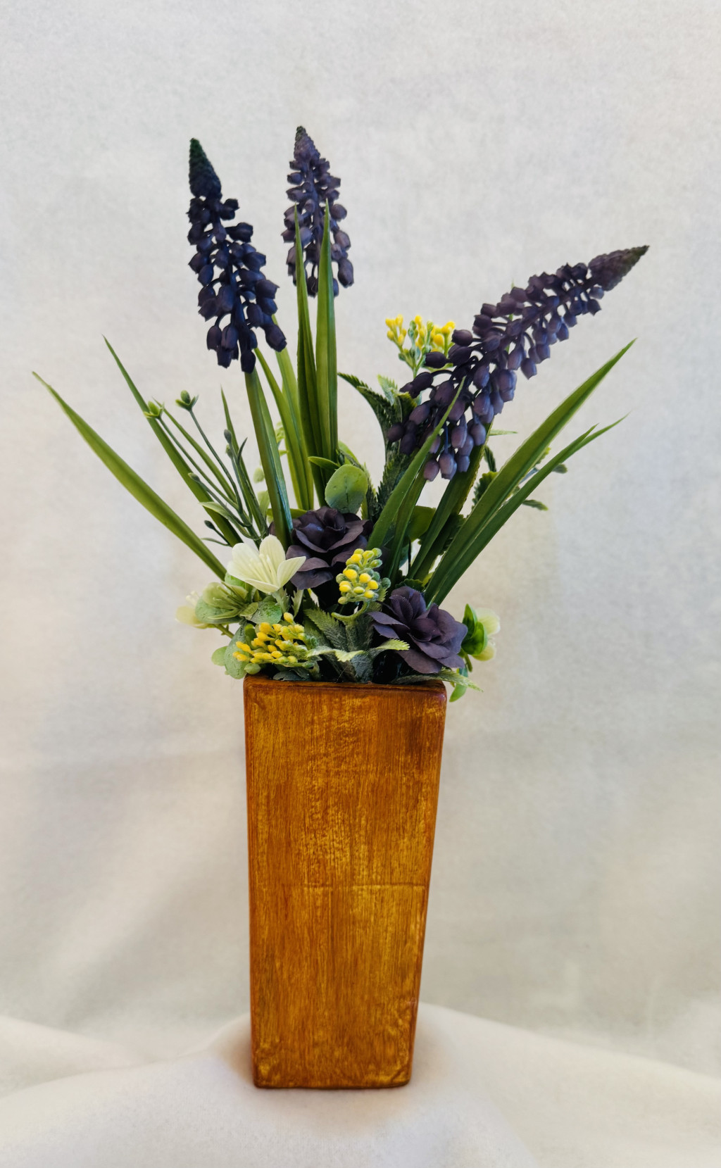 Asztaldísz lila fürtös gyöngyikével, apró fehér és lila virágokkal, élethű zöldekkel és sárga bogyókkal.
