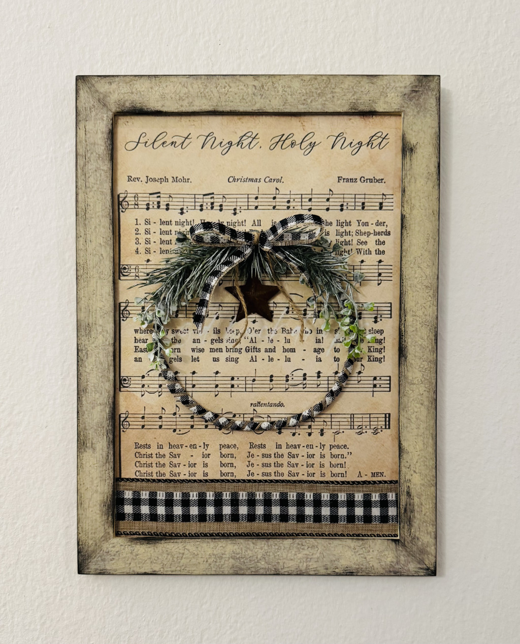 A Silent Night (Csendes éj) kottája lett díszítve, kockás szalaggal és egy pici koszorúval.